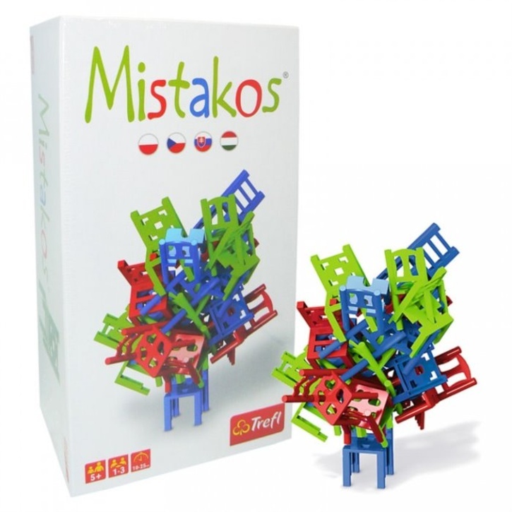 Skvělá hra pobaví nejen tebe, ale i tvé kamarády nebo rodiče. S Mistakos se nudit nebudeš. Vyzkoušej své dovednosti a schopnosti. Kolik židlí se ti podaří poskládat na sebe, než se pletenec nohou a opěradel zřítí? Mistakos je ideální hra pro společné večery s rodinou nebo na party. Hru lze hrát dvěma způsoby. Mistakos je zábavnou obdobou tradiční jenga věže nebo mikáda. Doporučeno pro děti od 5 let. Obsah balení je 24 židlí ve třech barvách (8 zelených, 8 modrých a 8 červených).