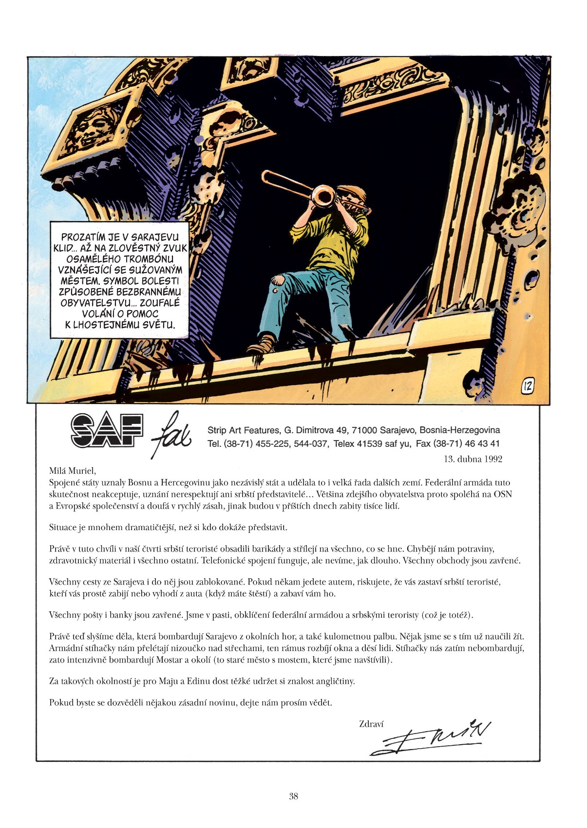 Fax ze Sarajeva vydala Crew hned z několika důvodů. Jedním z nich je sám kreslíř Joe Kubert, který skutečně patří mezi největší ikony komiksu vůbec a u nás zatím nedostal zasloužený prostor. Je to tvůrce, který má za sebou jak práci na ikonických hrdinech (Tarzan, Punisher), válečných příbězích (Sgt. Rock, America at War, Dong Xoai – Vietnam 1965), tak na příbězích s vážným tématem, obvykle čerpajících z jeho židovského původu (Jew Gangster, Yossel). Joe Kubert ohromil svým dynamickým a emocemi nabitým stylem – a dokonce se stal zakladatelem jedné z prvních škol učících komiksovou kresbu! Takže vydáním tohohle komiksu mu i my vzdáváme svůj hold.