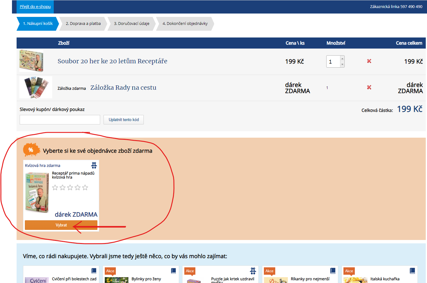 Pokud se Vám dárek neobjeví v košíku ZDARMA automaticky, stačí si pod košíkem kliknout u dárku na tlačítko Vybrat: