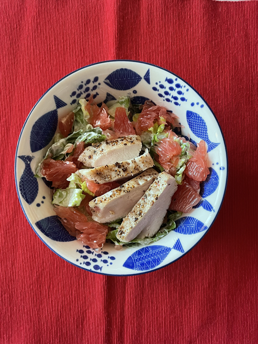 Listy rozdělte do dvou misek a každou z porcí doplňte kousky grapefruitu, cibulí s octem a nakrájeným kuřetem, pak podávejte.