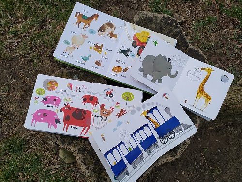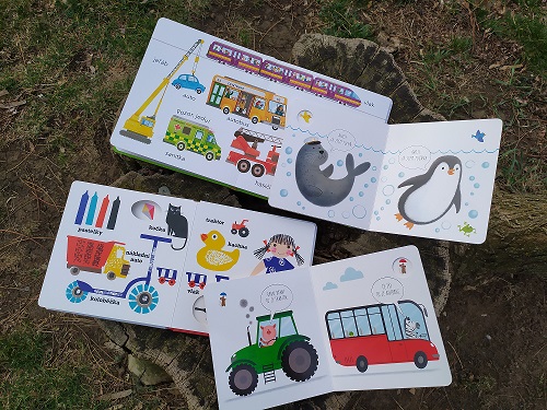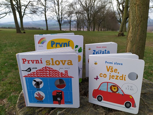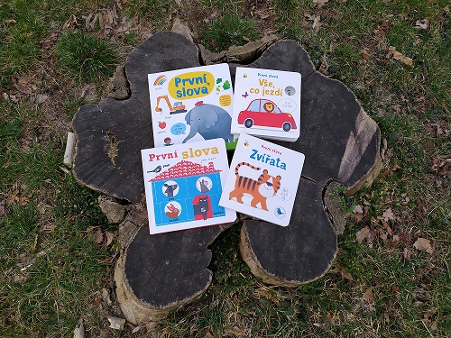 První kniha nabídne velkou škálu slov z přírody, zvířátek na statku, v zoologické zahradě i v podmořském světě. Děti se naučí i rozlišovat barvy, mohou spočítat ovoce či rozeznat geometrické tvary. Naučí se pozdravit, vyjádřit své pocity, například když je někdo šťastný, ilustrace napoví, jaký má dotyčný i výraz v obličeji apod. Také si děti mohou procvičit jednotlivé části těla. Především chlapci budou nadšení z dopravních prostředků. Který kluk by nepoznal hasičské auto? Chybět nebudou ani první slůvka okolo počasí či jídla a mnohé další ilustrace dodávají leporelu ten správný šmrnc.